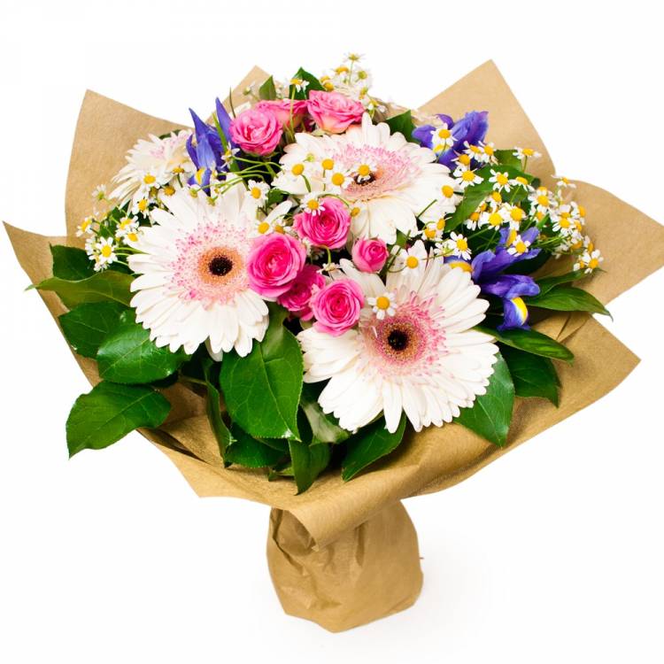 Ирисы, герберы, кустовые розы и ромашки, собранные воедино, представляют собой достаточно нетрадиционное, но элегантное и нежное сочетание. Гармонируя между собой, такие цветы способствуют игривому, романтическому настроению, которое свойственно для беззаботной юности.