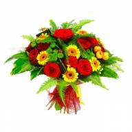 В ярком букете «Пальма» присутствуют несколько цветов: красный, желтый и зеленый». Сочетание маленьких гербер гермини, роз и хризантем вызовет непередаваемые эмоции у каждого. Цветы букета означают улыбку, небольшую тайну и любовь, так что букет отлично подойдет, чтобы впервые или еще раз сказать дорогому человеку о его значимости в жизни.
