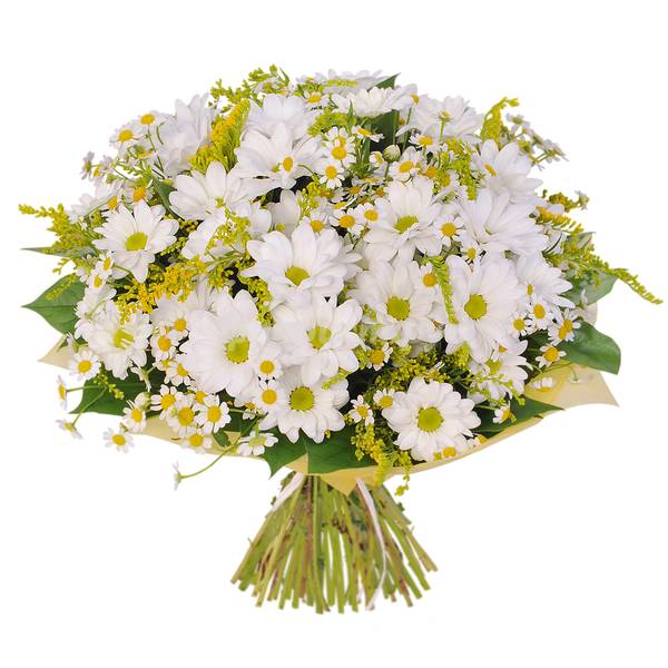 «Русское поле» - букет, состоящий из типичных для России красивых ромашек и ромашковых хризантем. Белая гамма букета расположит к себе, символизируя искренние намерения и хорошее отношение. Букет подойдет друзьям или коллегам для извинения или как чистый жест. Поле чувствуется при каждом вдыхании аромата, перенося к беззаботности и отвлеченности.